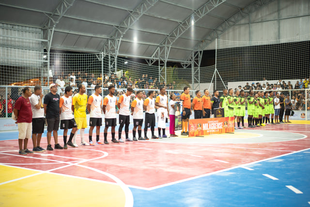As 35 equipes inscritas no Campeonato Milagrense de Futsal – 30 masculinas e 5 femininas – entraram em quadra acompanhadas de suas musas, formando um dos momentos mais bonitos da solenidade. Logo após o desfile, a bola rolou para o jogo de abertura, com Matsubara vencendo o Giba FC por 3 a 2 em uma partida bastante disputada.